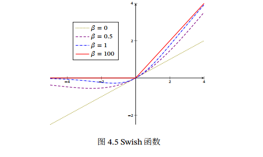 当 𝛽 = 1时,Swish函数在 𝑥 > 0时近似线性, 在 𝑥 < 0 时近似饱和,同时具有一定的非单调性.